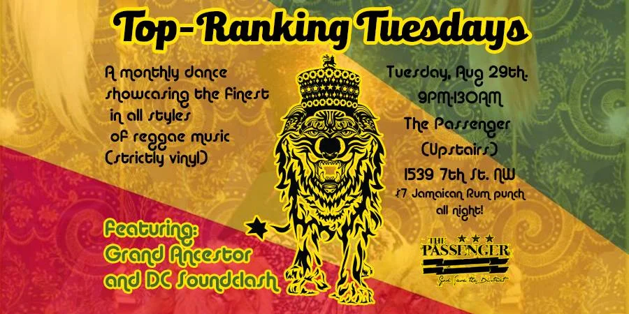 Come join us for the second edition of our free monthly reggae party upstairs at The Passenger (Hogo). Top Ranking Tuesday is dedicated to showcasing all of the numerous styles of reggae music, while played exclusively on vinyl - as they should be. This month's musical stylings from the Washington, D.C. based record label / sound system / DJ collective known as Grand Ancestor and the Dons known as DC Soundclash. Passenger will also be serving $7 Jamaican Rum Punch for attendees of the event all night. All tribes welcome. See you inna di dance!